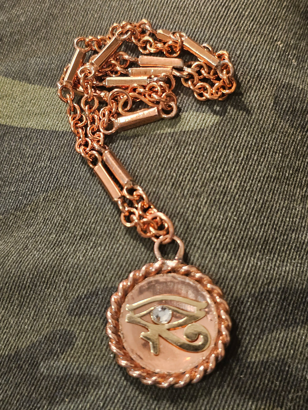 At the center is an Empowerment Cubit Tensor Ring–based pendant, designed using sacred geometric proportions traditionally associated with balance, amplification, and energetic stability. The Eye of Protection symbol is layered in brass over a solid copper base and accented with a clear stone—representing awareness, clarity, and empowerment.